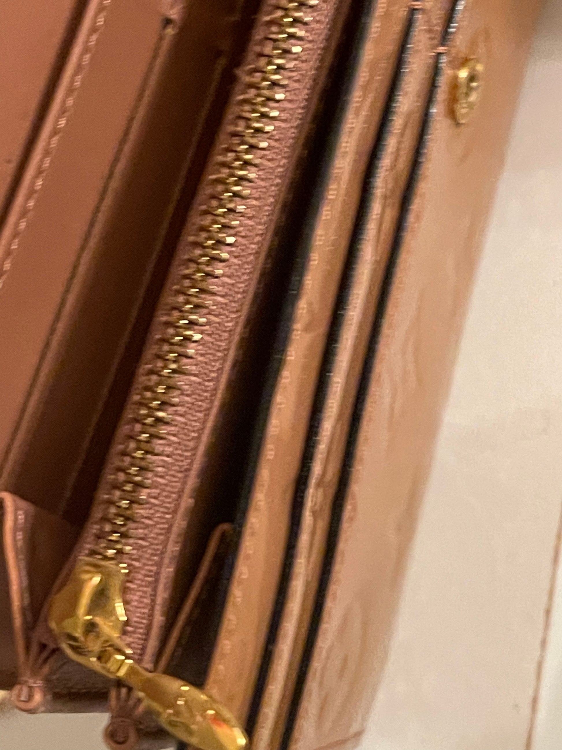 This patent leather shows off a glossy sheen of luxury with its embossed monogram leather that opens with a front flap snap to a cream-nude leather interior. Interior includes compartments lined with card slots and a zipper compartment.